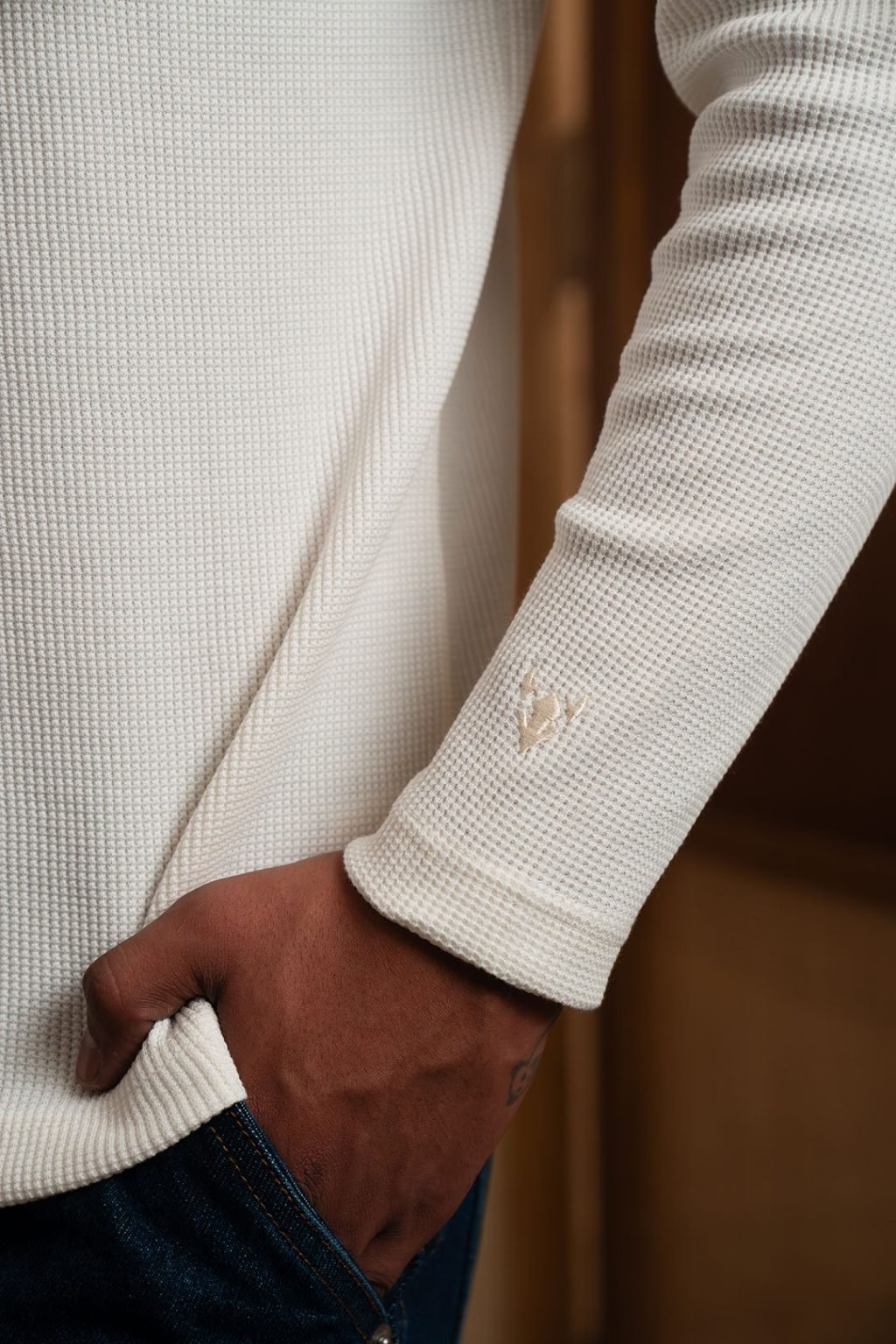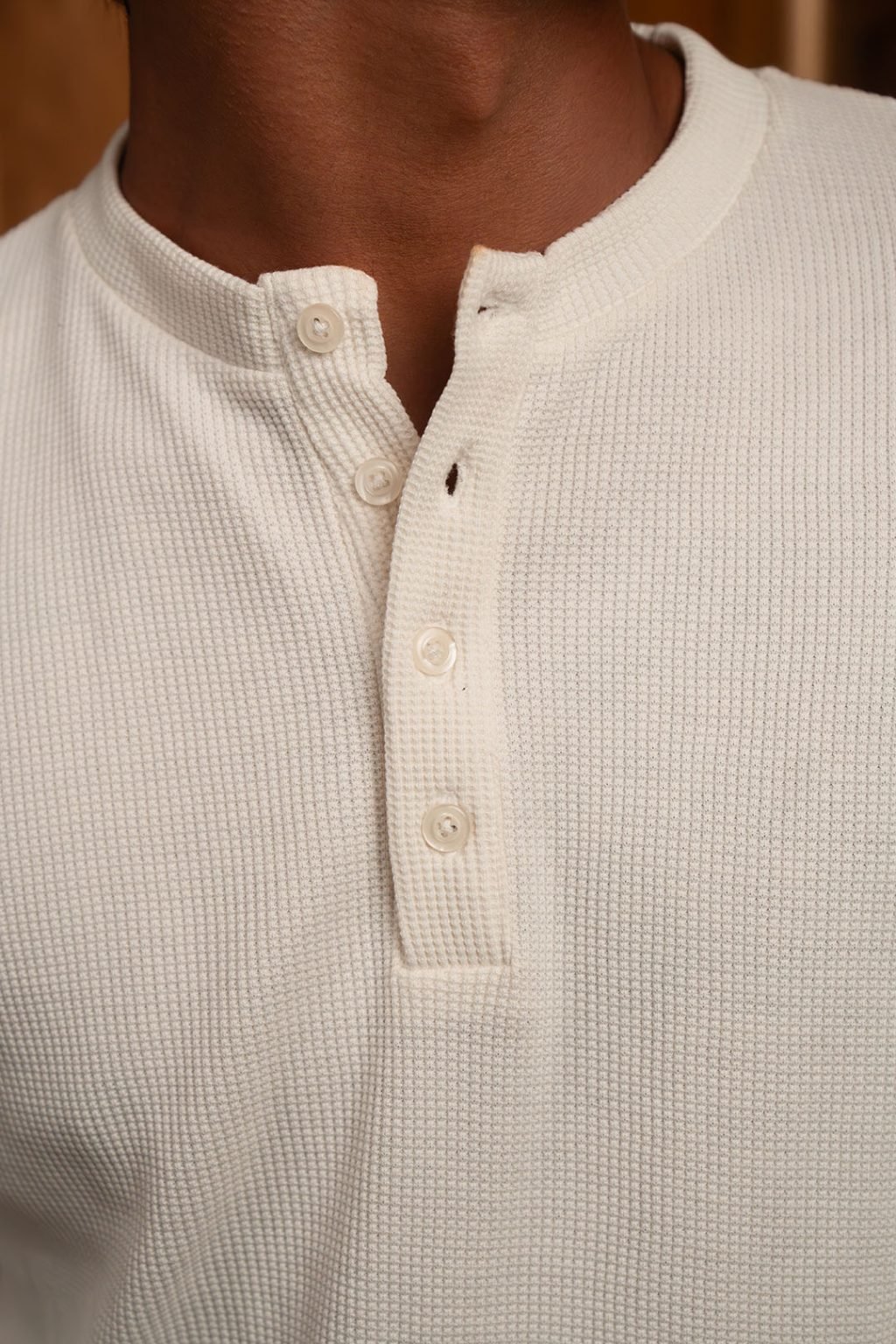 This is our Waffle-Knit Henley T-Shirt in Cream. Made from breathable, 100% cotton fabric, it features a classic waffle texture that adds depth and style. Designed with a Four-button placket, ribbed cuffs, and a tailored fit, this Henley blends timeless design with modern comfort.